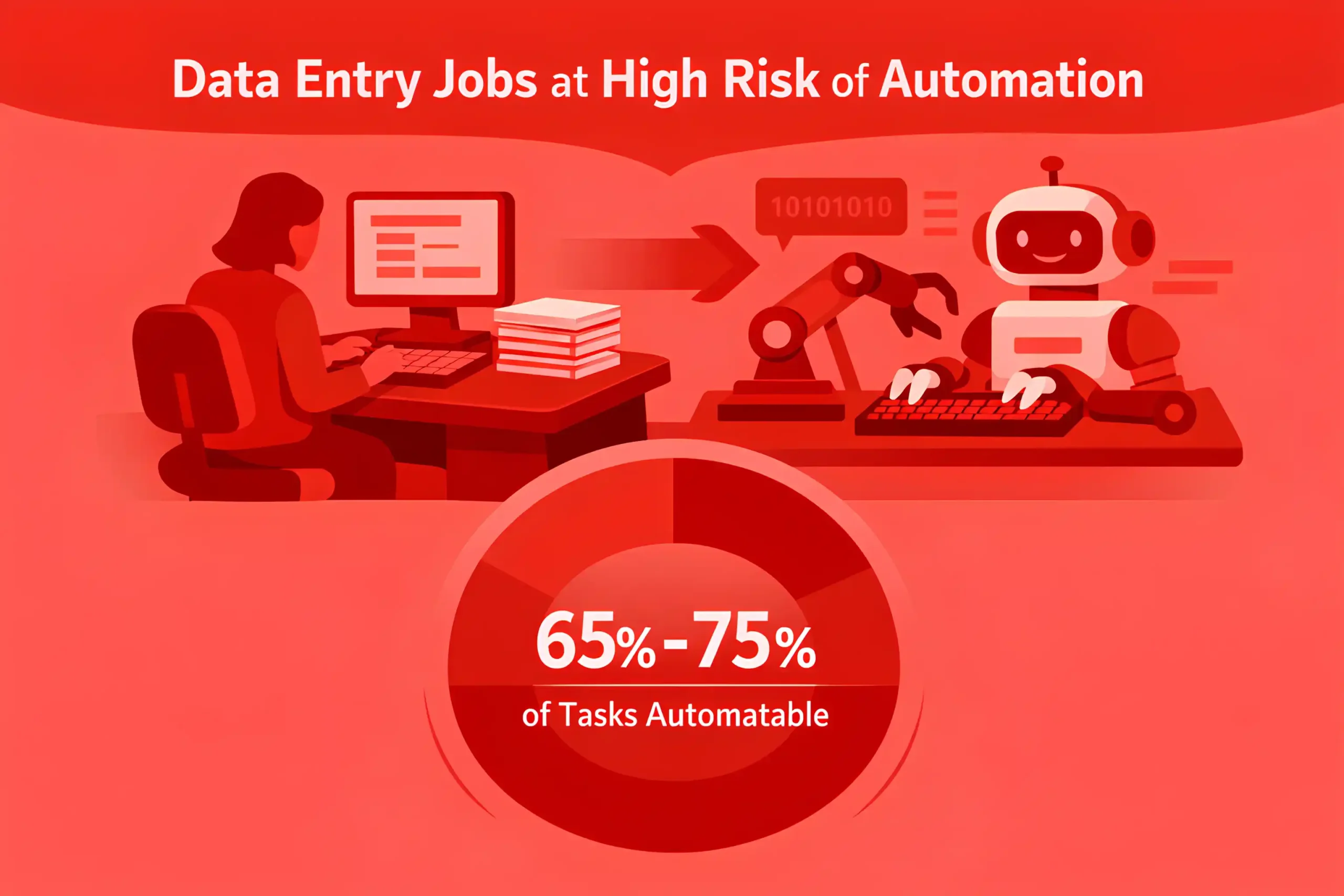 Data entry roles face the highest automation exposure, with 65 to 75% of tasks now technically automatable using modern AI systems.