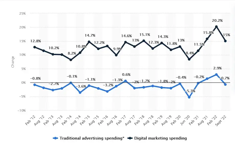 First, digital marketing is dominating practically all industries. This chart from Statista shows the prevalence of digital marketing spending compared to traditional advertising methods: